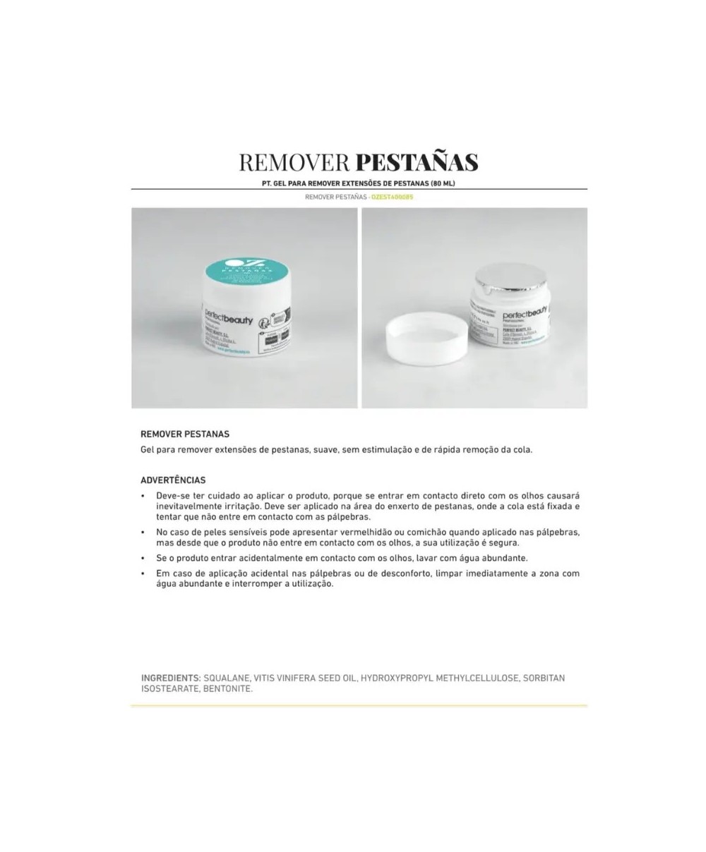 ADVERTÊNCIAS • Deve-se ter cuidado ao aplicar o produto, porque se entrar em contacto direto com os olhos causará inevitavelmente irritação. Deve ser aplicado na área do enxerto de pestanas, onde a cola está fi xada e tentar que não entre em contacto com as pálpebras. • No caso de peles sensíveis pode apresentar vermelhidão ou comichão quando aplicado nas pálpebras, mas desde que o produto não entre em contacto com os olhos, a sua utilização é segura. • Se o produto entrar acidentalmente em contacto com os olhos, lavar com água abundante. • Em caso de aplicação acidental nas pálpebras ou de desconforto, limpar imediatamente a zona com água abundante e interromper a utilização.