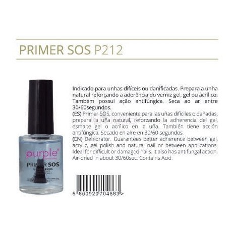 O PRIMER SOS é indicado para unhas difíceis e prepara a unha natural reforçando a aderência do verniz gel, gel, acrygel e acrílico à unha natural. Evite o contacto com as cutículas e pele. Contém ácido.