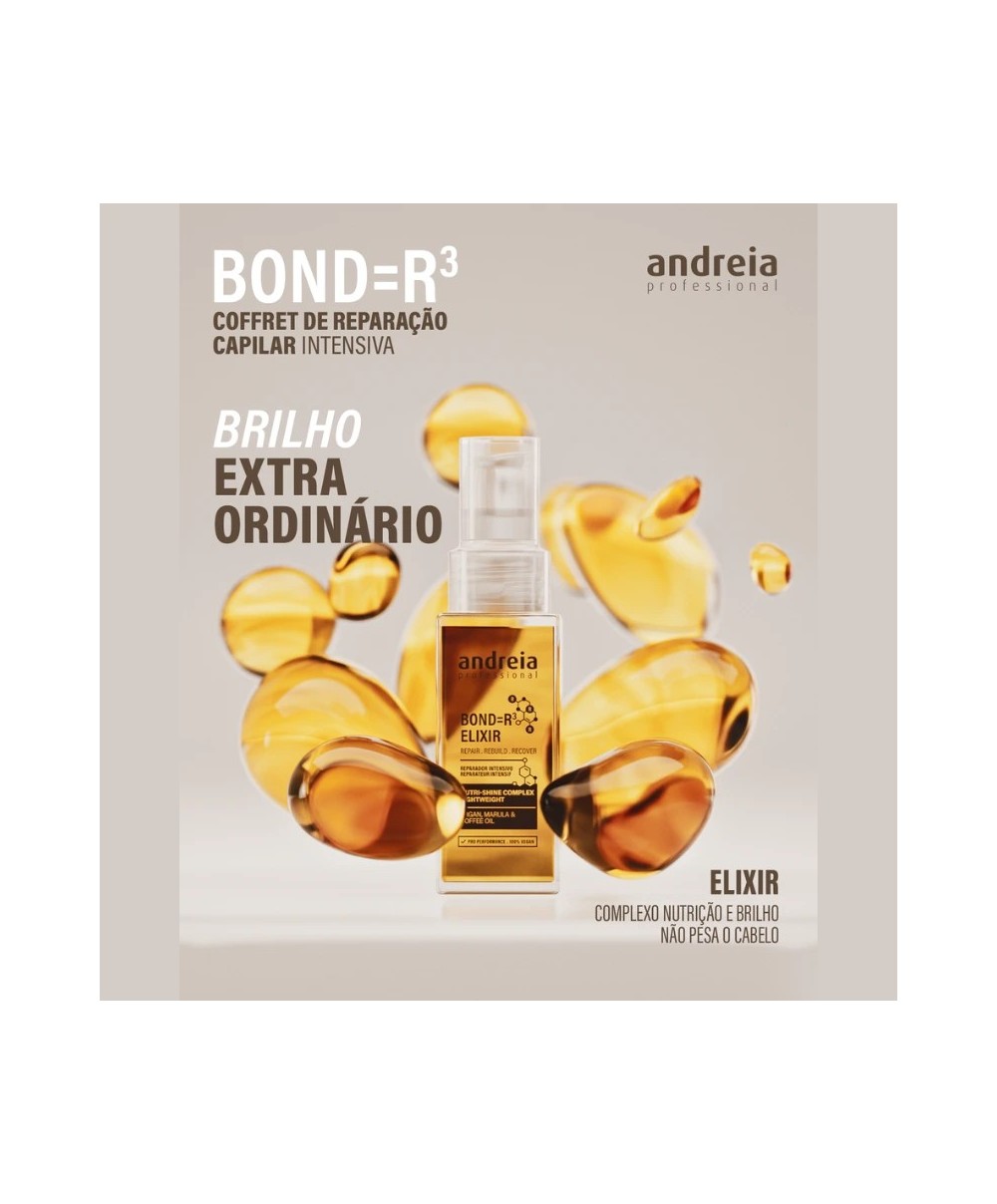 BOND=R³ Elixir Reparador Intensivo: Finalizador leve, com complexo nutrição e brilho, enriquece com óleos de argão, marula e café. Textura rápida a absorver, sem pesar ou deixar resíduos.