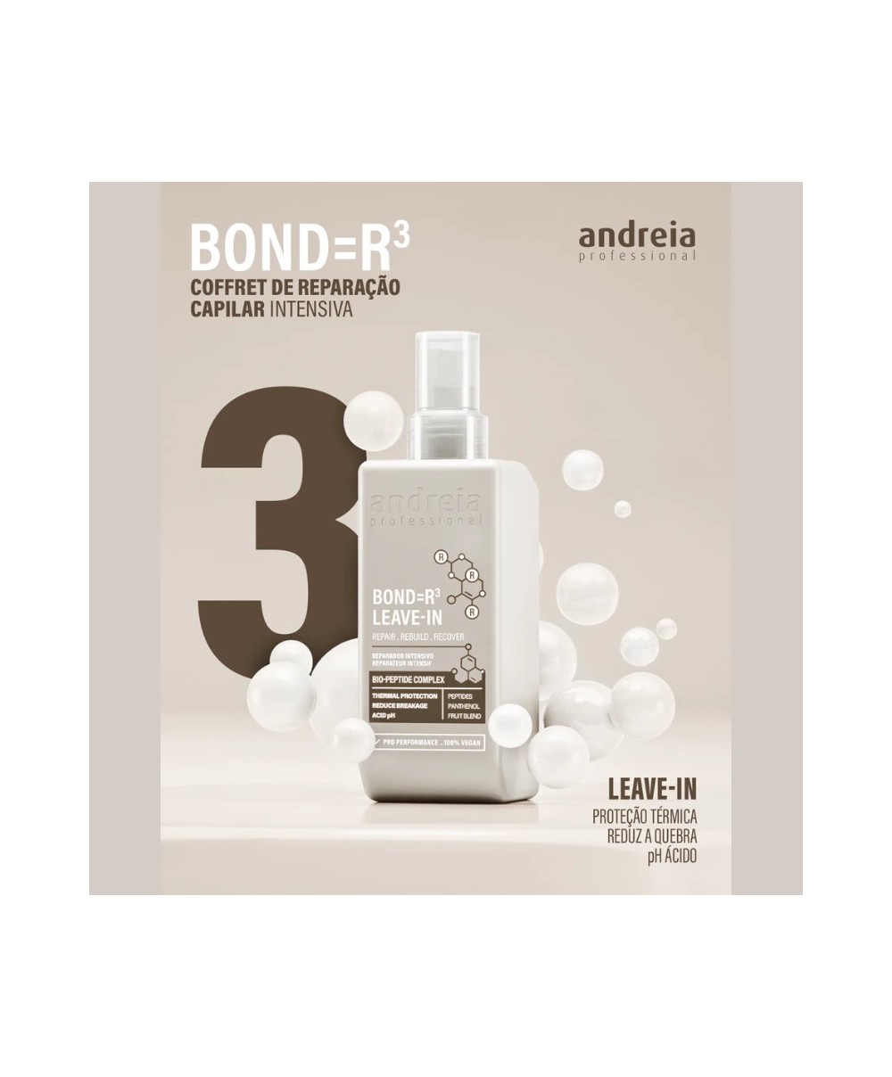 BOND=R³ Leave-In: Tratamento reparador com complexo bio-péptidos e proteção térmica, reduz a quebra e mantém o cabelo saudável.